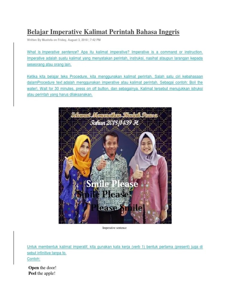 Remove the bread from the oven contoh imperative sentence (kalimat perintah bahasa inggris) . This research has a title " kalimat imperatif dalam bahasa inggris dan bahasa saluan" and focuses on the types, functions, similarities, and differences of . (bersihkan ruang kelas ini sekarang!) · call my dad right now! Contoh imperative sentence (kalimat perintah bahasa inggris): Kalimat perintah (imperative sentence) bertujuan untuk memberikan suatu perintah kepada seseorang.