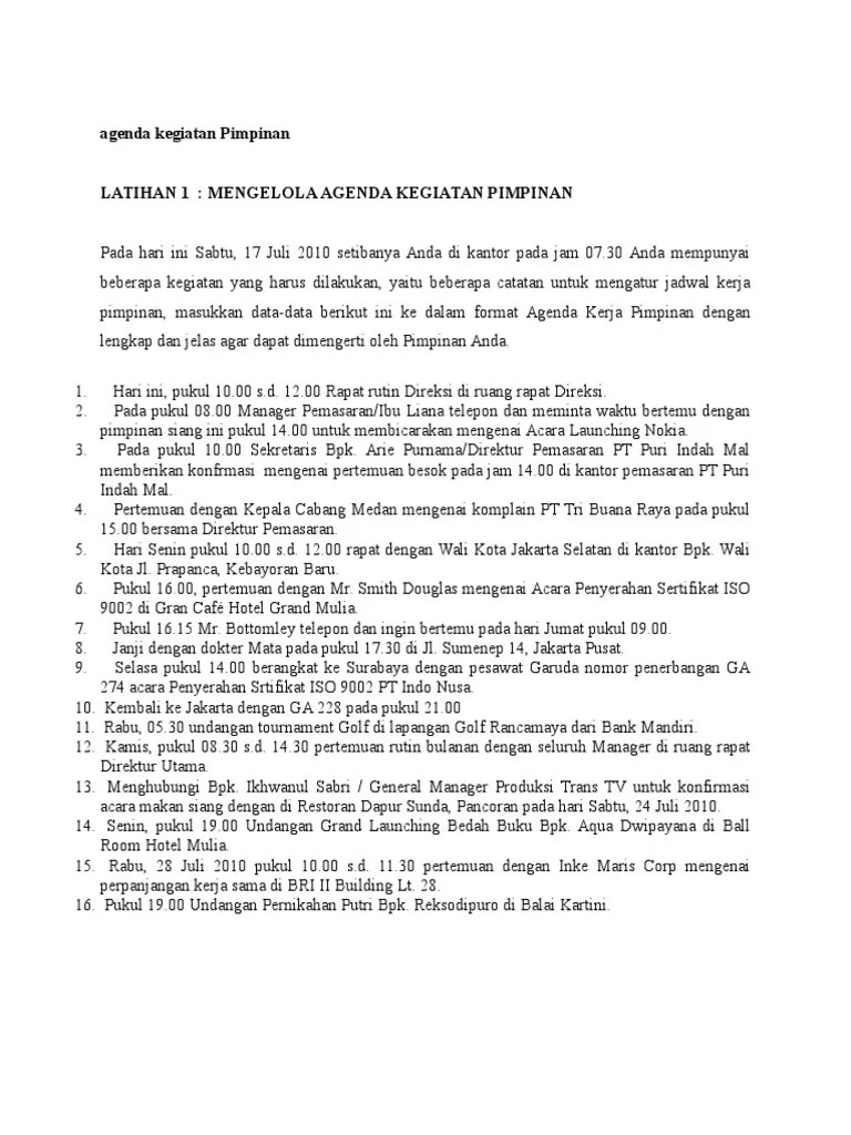 1, prosedur :pencatatan agenda pimpinan. Mengelola agenda kegiatan pimpinan pada hari ini sabtu,. No hari tangal waktu kegiatan tempat keterangan. 1 jumat 3 oktober 2008 09.00 wib menghadiri sebagai nara sumber. Agenda kegiatan pimpinan latihan 1 :